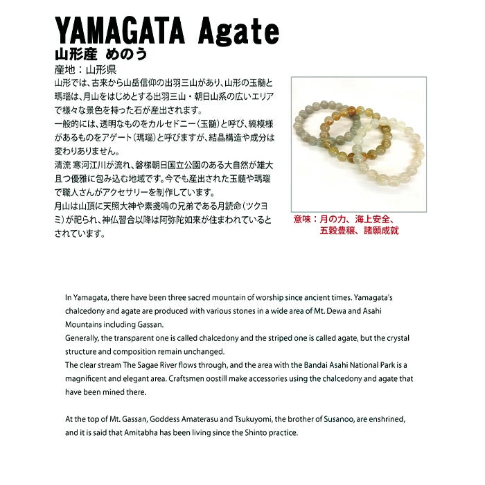 Yamagata has the Dewa Three Mountains, which have been worshipped since ancient times, and Yamagata, Dewa Three Mountains, and Asahi Mountain cordillera produce a variety of stones with different appearances. Generally, transparent stones are called chalcedony and striped stones are called agate, but the crystal structure and composition are the same. The clear Sagae River flows through the area, and the Bandai Asahi National Park is an area of majestic and elegant nature. Even today, artisans make accessories from the chalcedony and agate produced here. At the peak of Mount Gassan, Amaterasu Omikami and Tsukuyomi, brother of Susanoo, are enshrined, and since the syncretism of Shinto and Buddhism, it has been said that Amida Nyorai resides there.