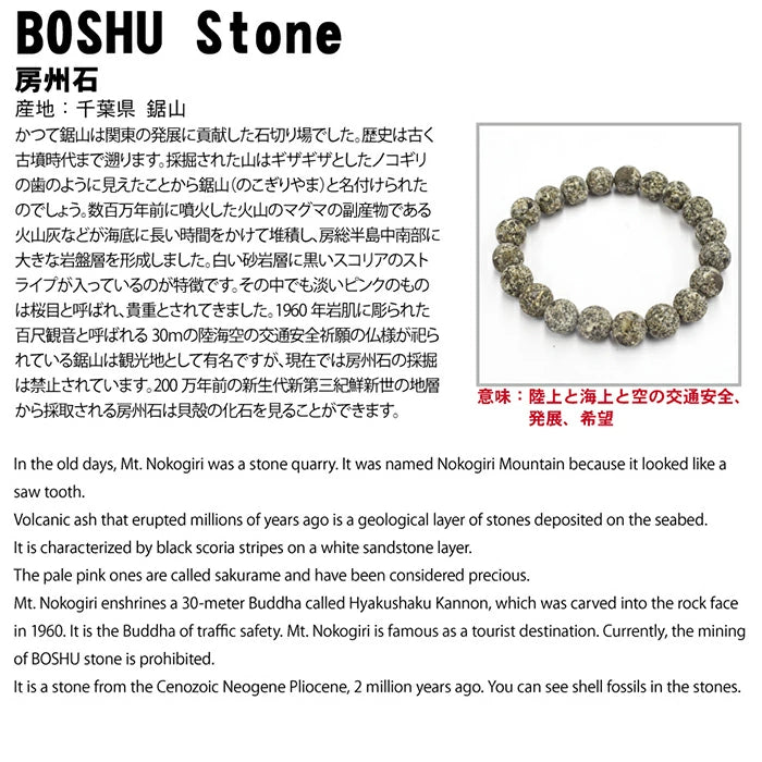 Its history dates back to the Kofun period. The mountain from which the stones were extracted resembled the jagged teeth of a saw, hence the name Mount Nokogiri. Volcanic ash, a by-product of magma from a volcano that erupted millions of years ago, accumulated on the seabed over a long period of time, forming a large bedrock layer in the central and southern part of the Boso Peninsula. It is characterized by black scoria stripes in the white sandstone layer. Among these, the pale pink ones are called sakurame and are considered valuable. Mount Nokogiri, which was carved into the rock face in 1960, is a famous tourist destination, but mining of Boshu stone is currently prohibited. Boshu stone, which is extracted from a stratum dating back 2 million years to the Pliocene period of the Cenozoic Era, contains fossilized shells.